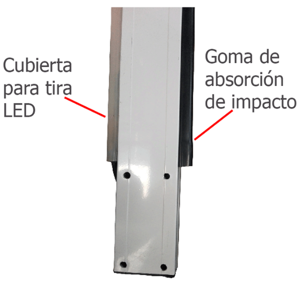 Tiene forma tipo cuadrada; no es ovalado y cuenta con rieles para ajuste de caucho plástico protector para caso de accidentes y LED de circuito iluminado cuando esta cerrado el acceso en ROJO, y VERDE cuando se encuentra abierto el mismo.