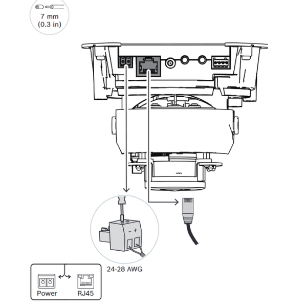 Se puede suministrar alimentación a la cámara mediante una conexión del cable de red compatible con alimentación por Ethernet. Con esta configuración, solo se necesita una única conexión de cable para ver, alimentar y controlar la cámara. El uso de alimentación por Ethernet facilita la instalación y la hace más rentable, ya que las cámaras no necesitan una fuente de alimentación local.