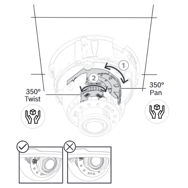 El sensor de giro/acelerómetro integrado corrige automáticamente la orientación de la imagen en ángulos de 90° si la cámara está montada en ángulo recto o hacia abajo. La imagen del sensor también se puede girar manualmente en ángulos de 90°.
