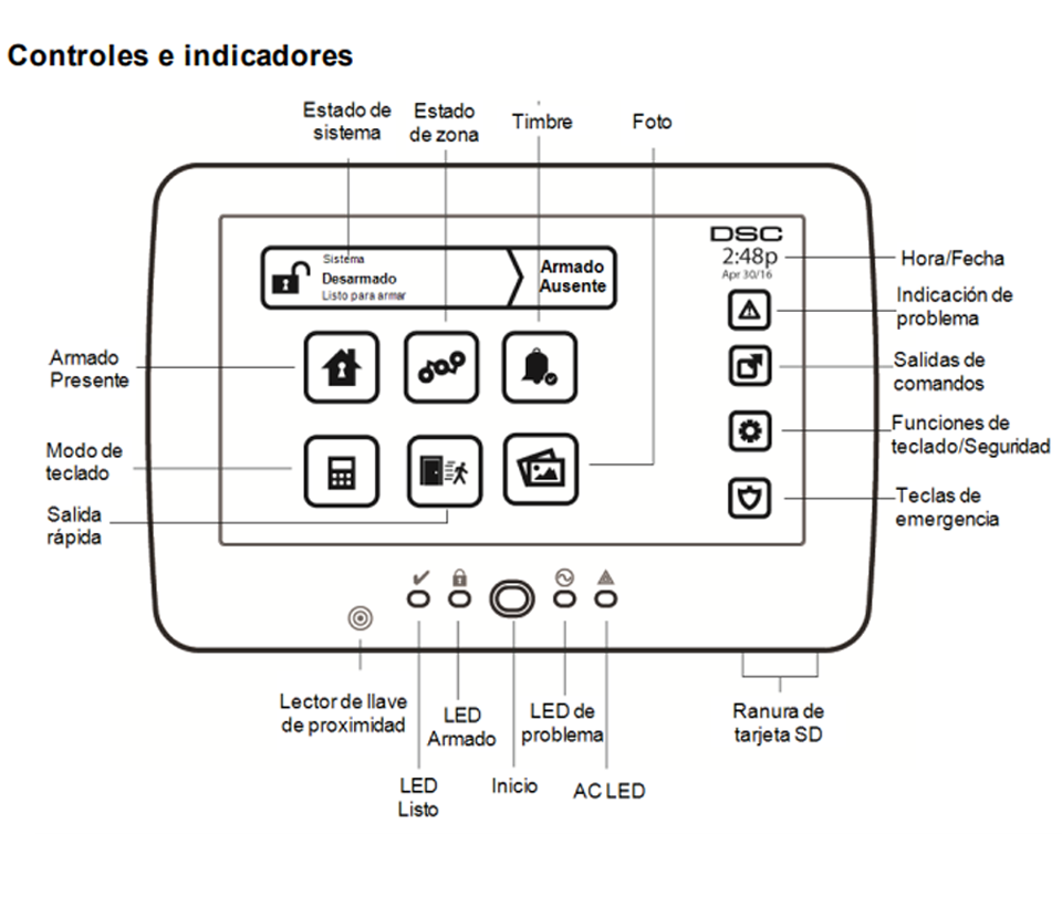 Listo (LED verde), Armado (LED roja), Fallo (LED amarilla), CA (LED verde)