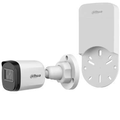 Paquete de Cámara bullet de 2 MP, lente de 3.6 mm y ángulo de visión de 80°. Visión nocturna IR de 30 m, resistencia IP67. Incluye caja de conexiones PFA12A de policarbonato resistente, ideal para exteriores Marca Dahua Modelos HAC-B1A21N-U + DH-PFA12A