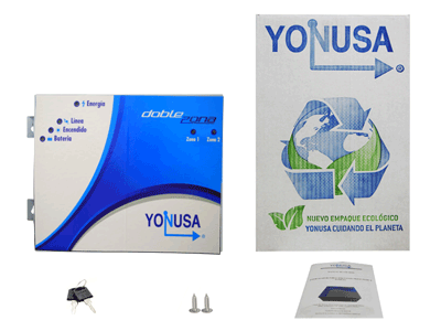 YONUSA EY10000127/2Z - Energizador de doble zona con un alcance de hasta 3,000 metros lineales cada una, 600 metros en 5 lineas por cada zona/ Soporta Sirena, modulo Wifi para notificacion, alertas y manipulacion remota del cerco electrico/ Sobrepedido 46171602